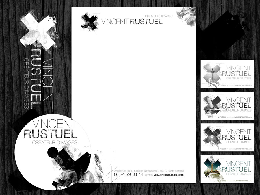 | Vincent Rustuel Vincent Rustuel is an other client that became friend, or friend which became client, I do not remember... he first contacted me some years ago as he liked graphic exchange and send me his photo book... We then develop his graphic language, bsed on my knowledge of his work and photographe personality... A mix of wild spirit and very strict way of work... He likes the idea to have several logos, based on a same one but being able to play with it... |